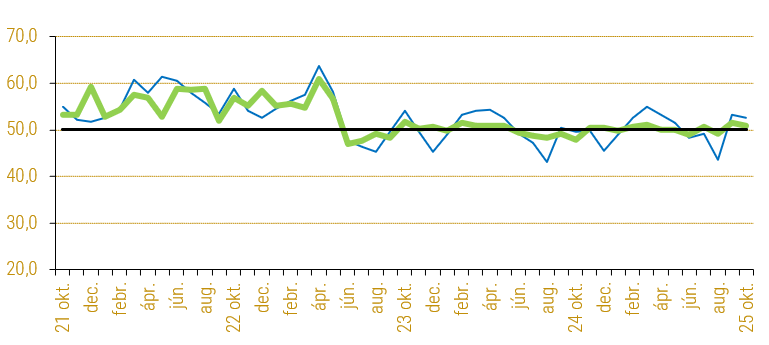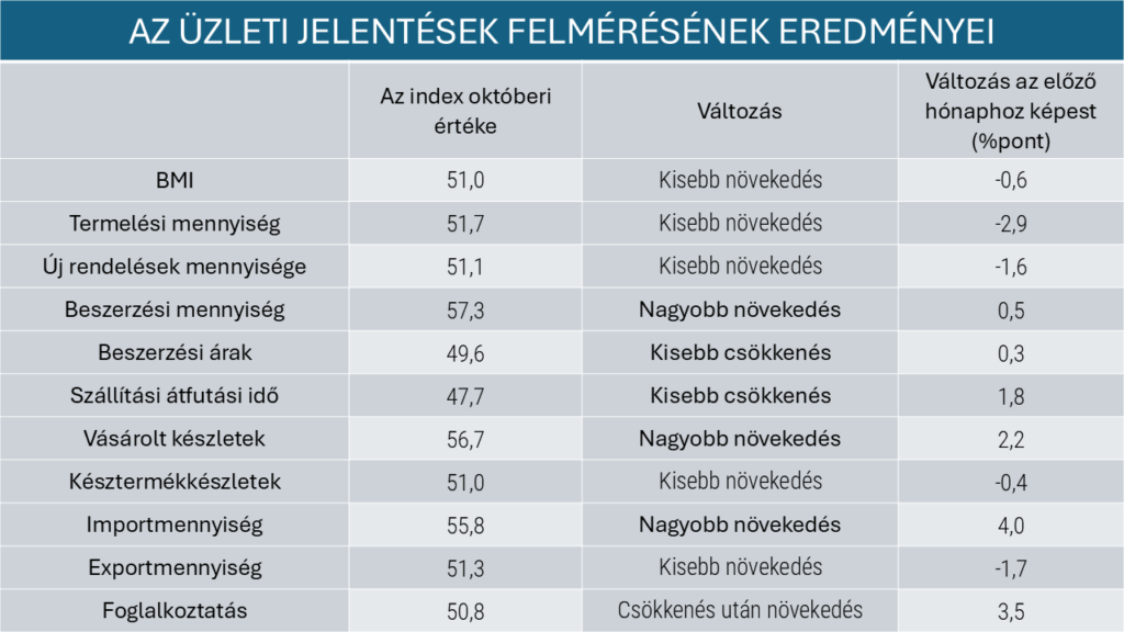 A beszerzési mennyiség indexe 0,5 ponttal nőtt, az index stabil emelkedést jelez. A késztermékkészletek indexe 0,4 százalékponttal csökkent. A 2025 októberi BMI index csökkent a szeptemberi (51,6) értékhez képest. Október átlag alatti hónapnak számít (az 1995 óta mért hosszú távú átlag értéke 52,6; az októberi értékeké 52,3). A most mért szezonálisan kiigazított BMI indexérték a tizedik legkisebb e havi érték.